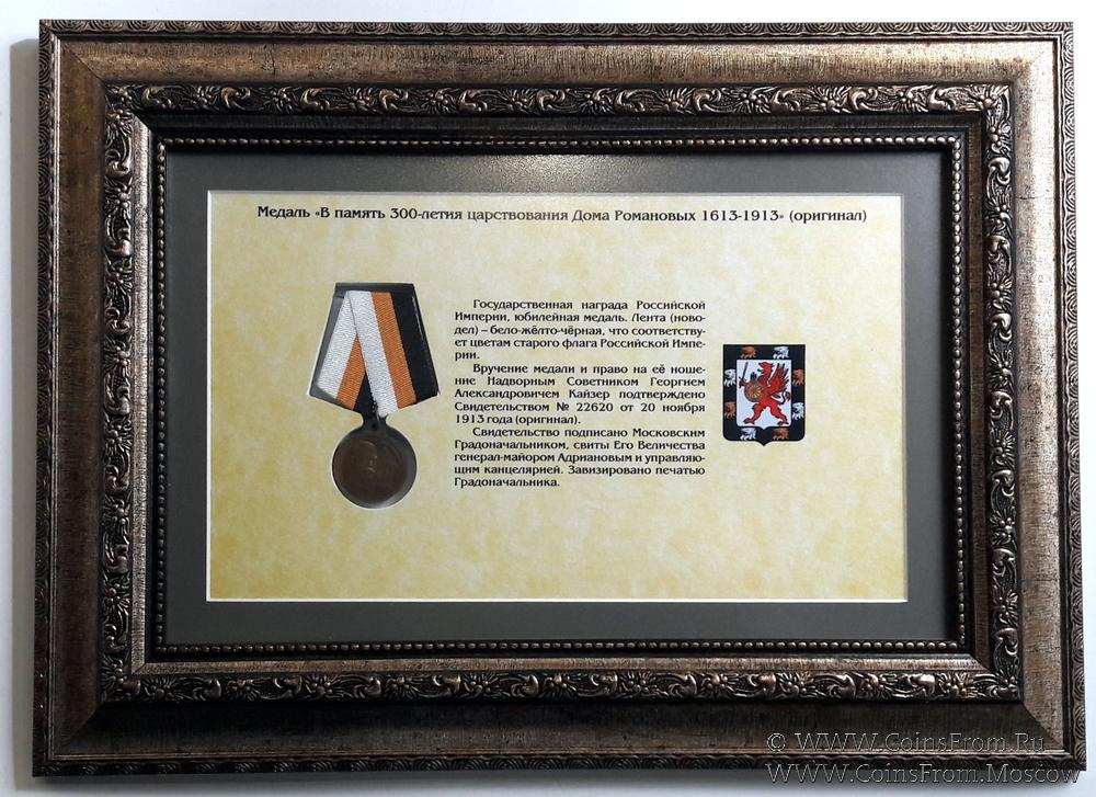 Медаль "В память 300-летия царствования Дома Романовых 1613-1913 гг." Оригинал. Размер рамки 40х29 см.