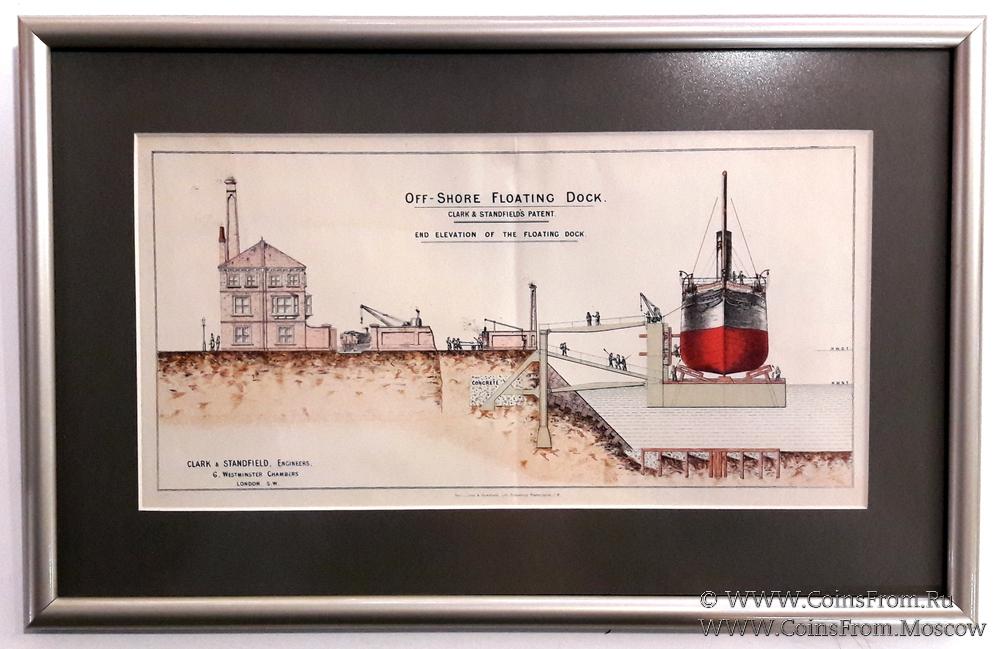Изображение плавучего дока и береговой части. Картина отпечатана в Лондоне.