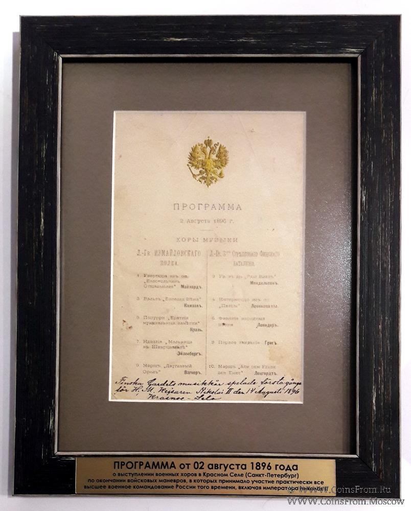 Программа от 2 августа 1896 года о выступлении военных хоров в Красном Селе (Санкт-Петербург) по окончании войсковых маневров, в которых принимало участие практически всё высшее командование России того времени, включая императора Николая II.