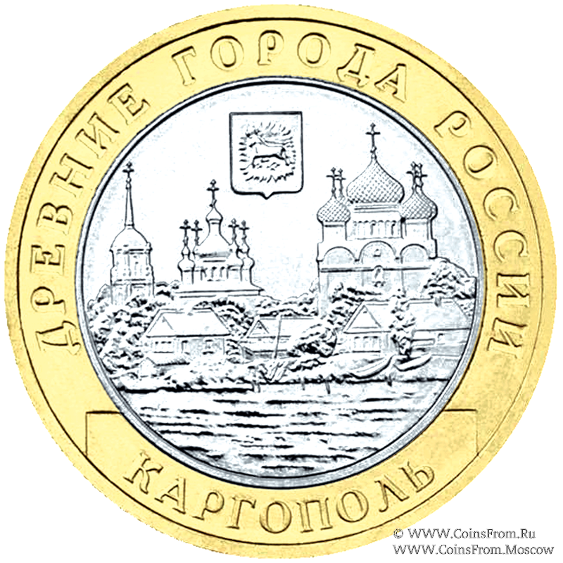Каргополь. Чеканка: Московский монетный двор (ММД). Оформление гурта: 300 рифлений, надпись «ДЕСЯТЬ РУБЛЕЙ», повторяющаяся дважды, разделенная звездочками.