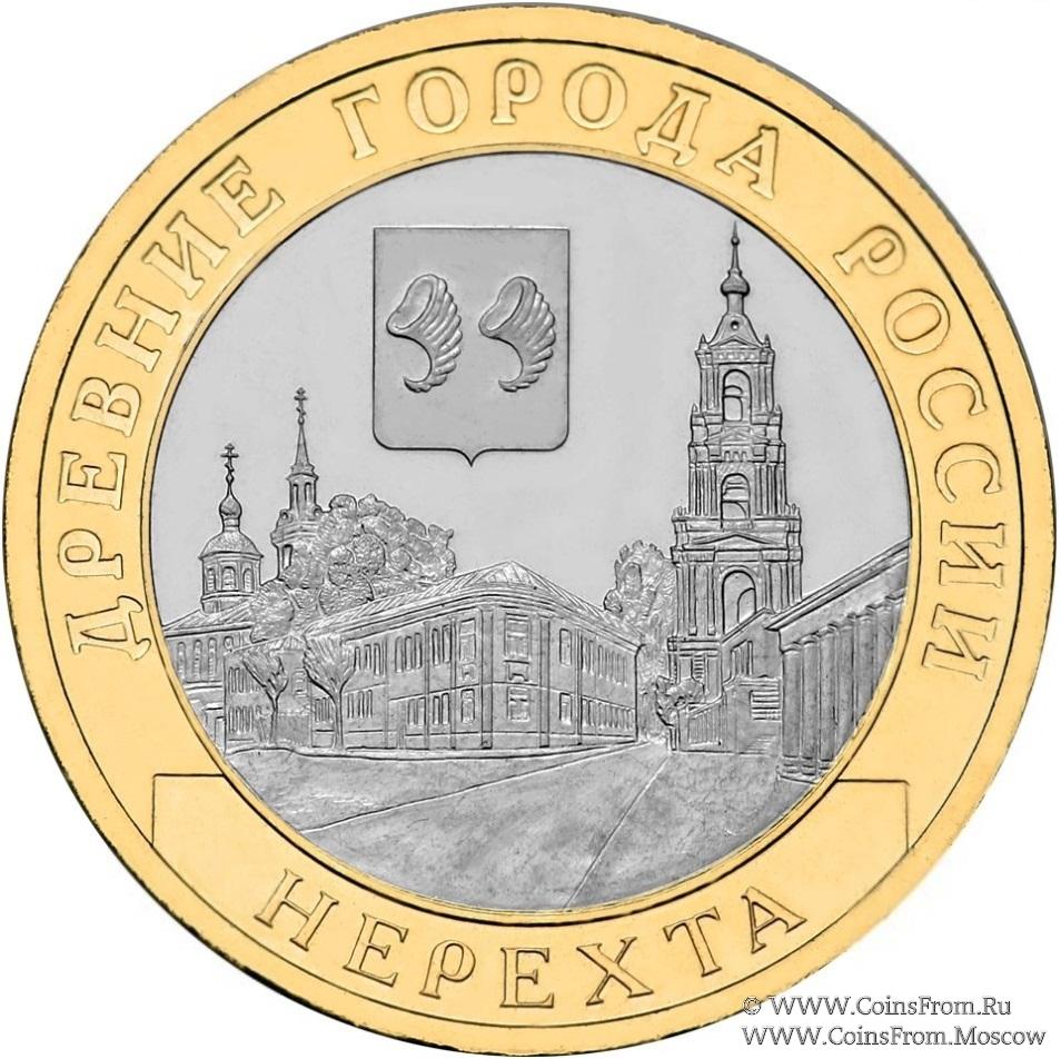 Нерехта, Костромская обл. Чеканка: Санкт-Петербургский монетный двор (СПМД). Оформление гурта: 300 рифлений и надпись "ДЕСЯТЬ РУБЛЕЙ", повторяющаяся дважды, разделённая звёздочками.
