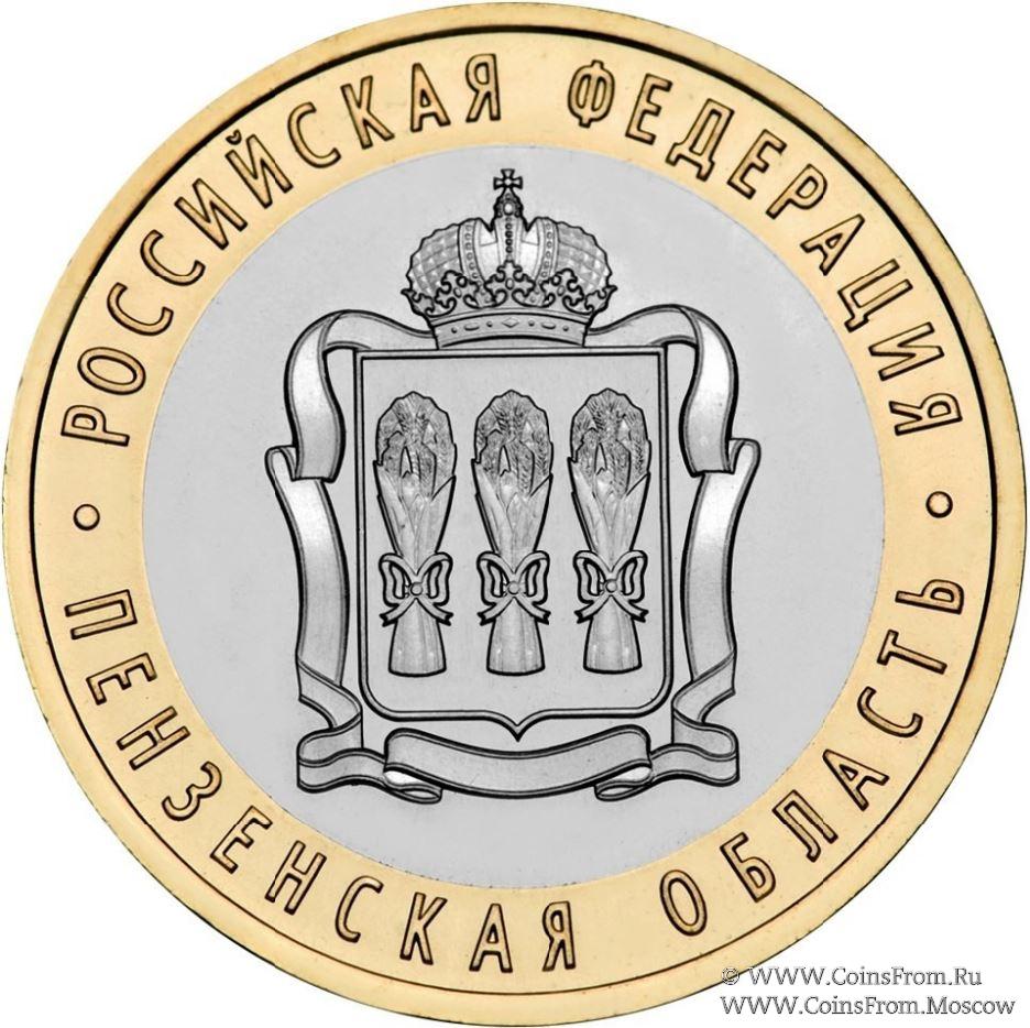Пензенская область. Чеканка: Санкт-Петербургский монетный двор (СПМД). Оформление гурта: 300 рифлений и надпись "ДЕСЯТЬ РУБЛЕЙ", повторяющаяся дважды, разделённая звёздочками.