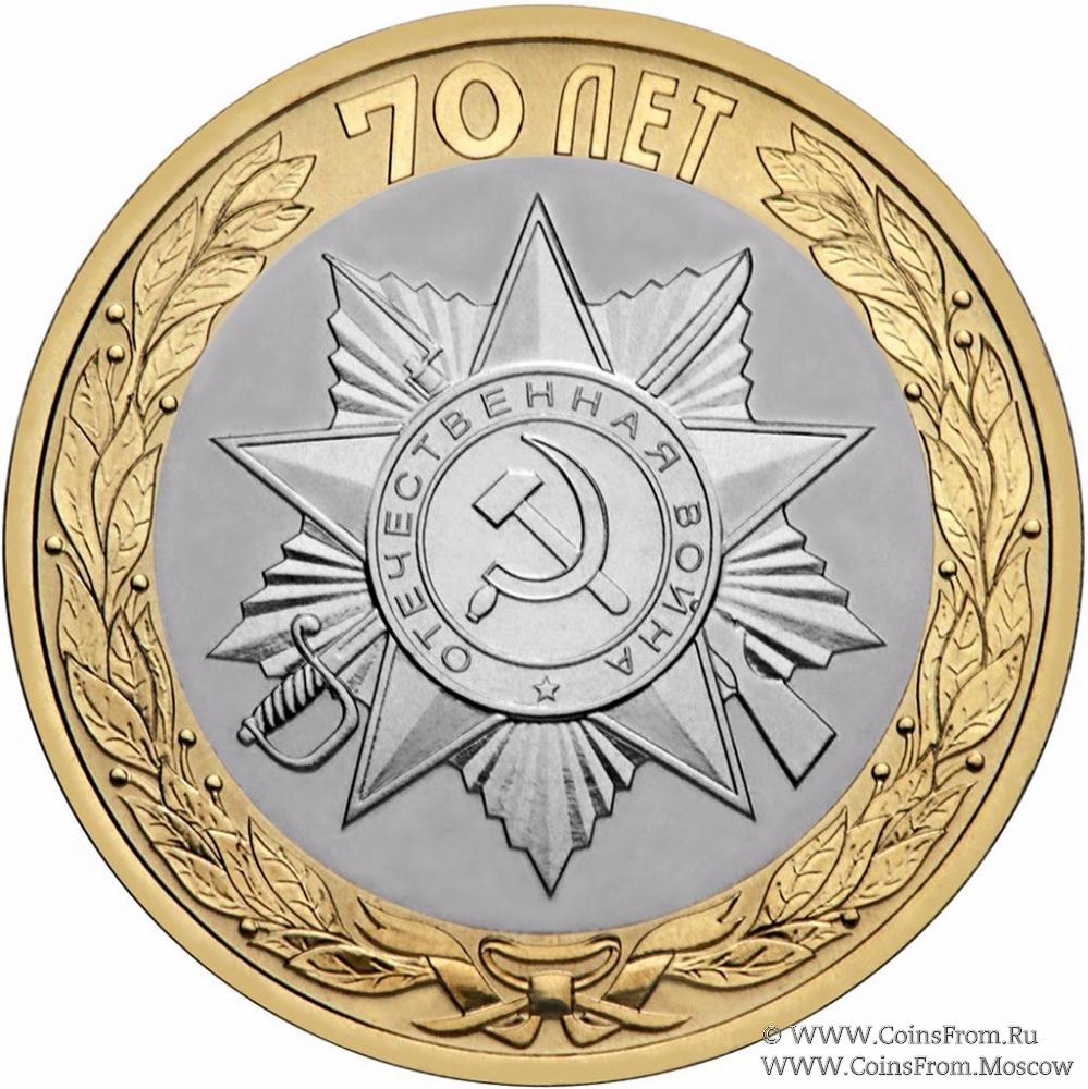 Официальная эмблема празднования 70-летия Победы. Чеканка: Cанкт-Петербургский монетный двор (СПМД). Оформление гурта: 300 рифлений и надпись "ДЕСЯТЬ РУБЛЕЙ", повторяющаяся дважды, разделённая звёздочками.