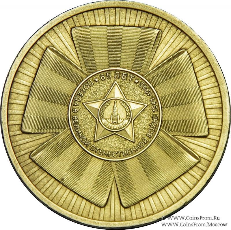Официальная эмблема 65-летия Победы. Чеканка: Санкт-Петербургский монетный двор (СПМД). Оформление гурта: 6 участков по 5 рифов и 6 участков по 7 рифов, чередующиеся с 12 гладкими участками.