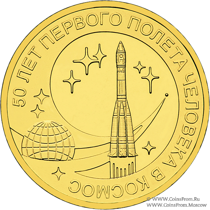 50 лет первого полета человека в космос. Чеканка: Санкт-Петербургский монетный двор (СПМД). Оформление гурта: 6 участков по 5 рифов и 6 участков по 7 рифов, чередующихся 12 гладкими участками.