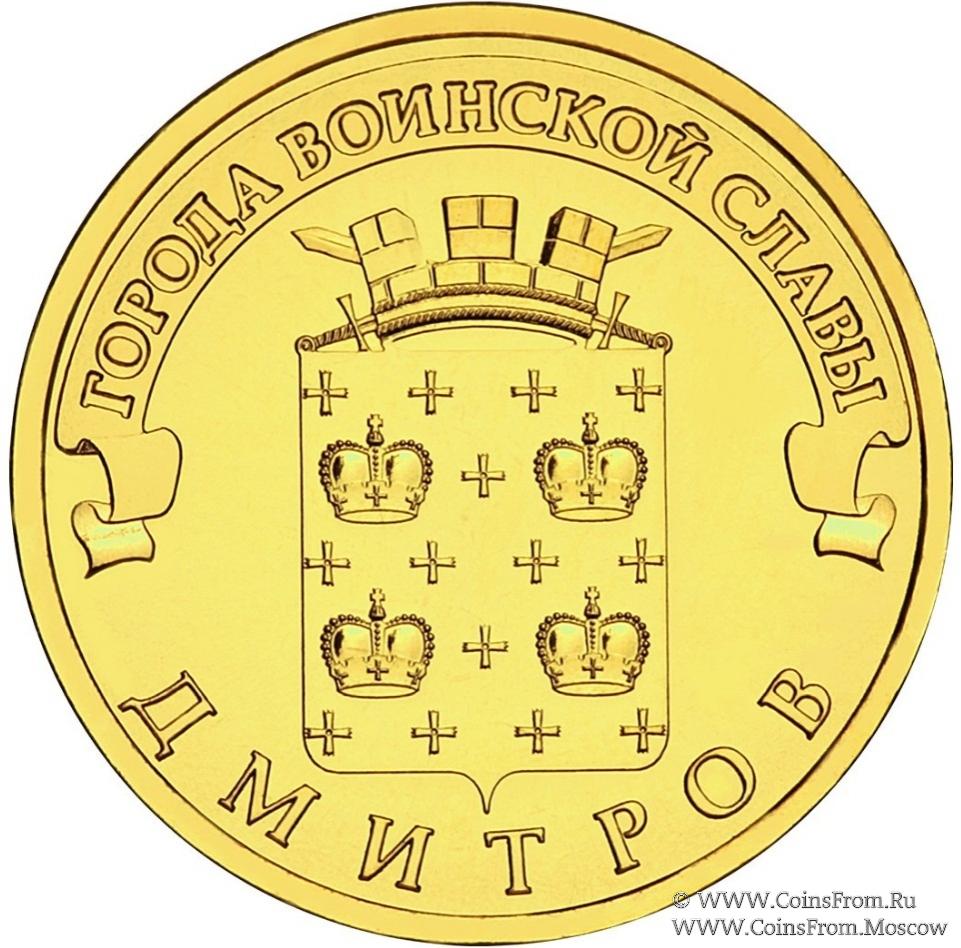 ГВС Дмитров. Чеканка: Санкт-Петербургский монетный двор (СПМД). Оформление гурта: 6 участков по 5 рифов и 6 участков по 7 рифов, чередующихся 12 гладкими участками.
