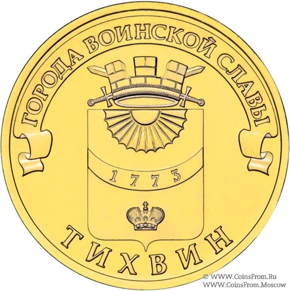 ГВС Тихвин. Чеканка: Санкт-Петербургский монетный двор (СПМД). Оформление гурта: 6 участков по 5 рифов и 6 участков по 7 рифов, чередующихся 12 гладкими участками.