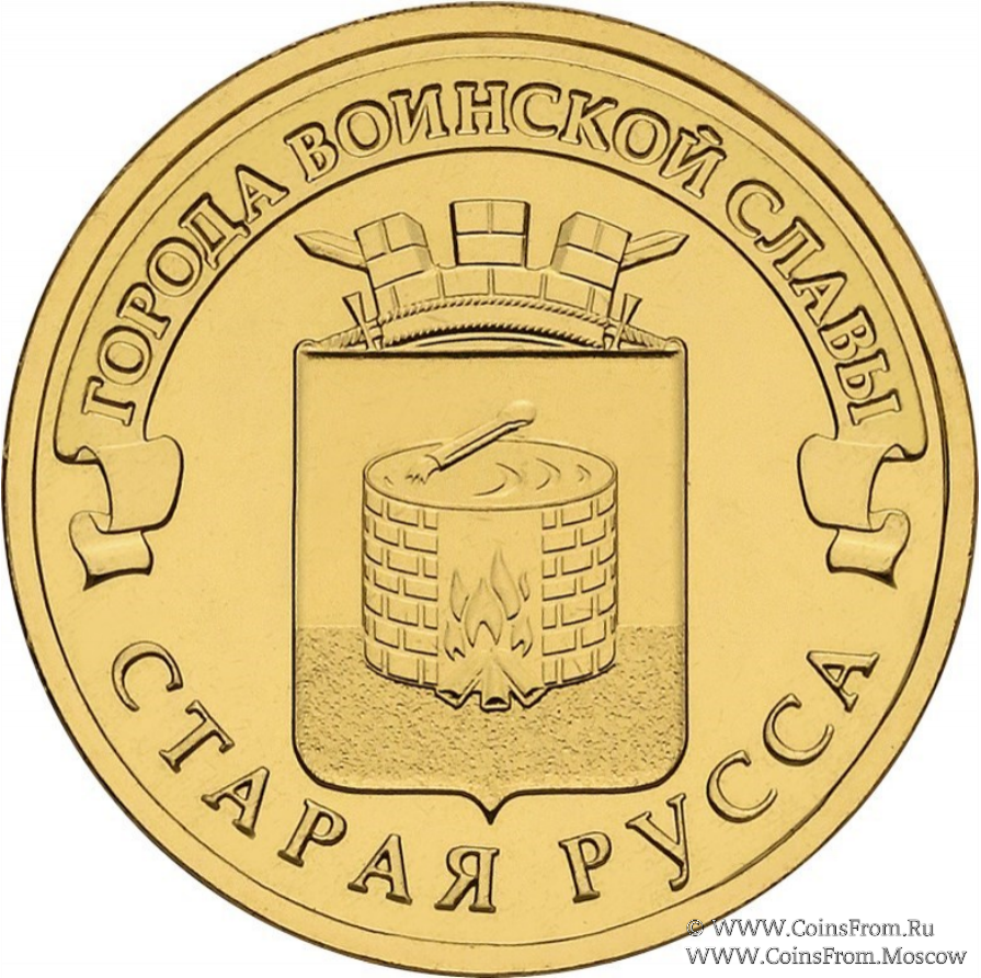 ГВС Старая Русса. Чеканка: Санкт-Петербургский монетный двор (СПМД). Оформление гурта: 6 участков по 5 рифов и 6 участков по 7 рифов, чередующихся 12 гладкими участками.