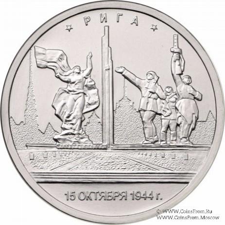 Рига. 15.10.1944 г. Чеканка: Московский монетный двор (ММД). Оформление гурта: 12 участков по 5 рифов каждый.
