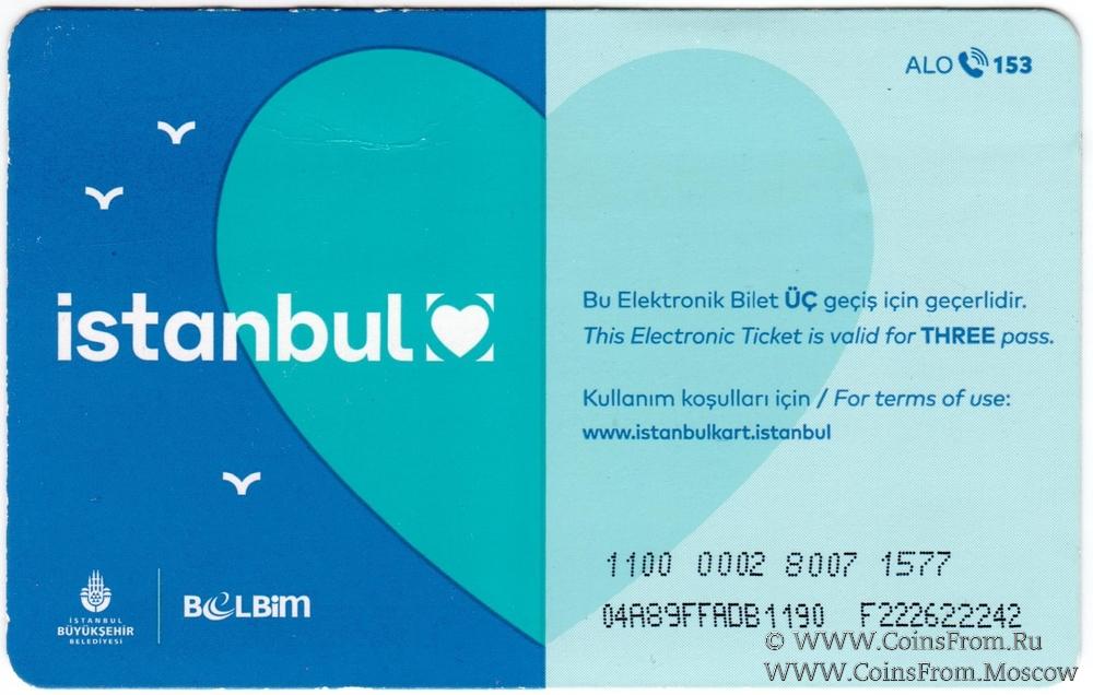 Транспортная карта Стамбула для проезда в общественном транспорте по полной стоимости на 3 поездки. Плотная бумага.