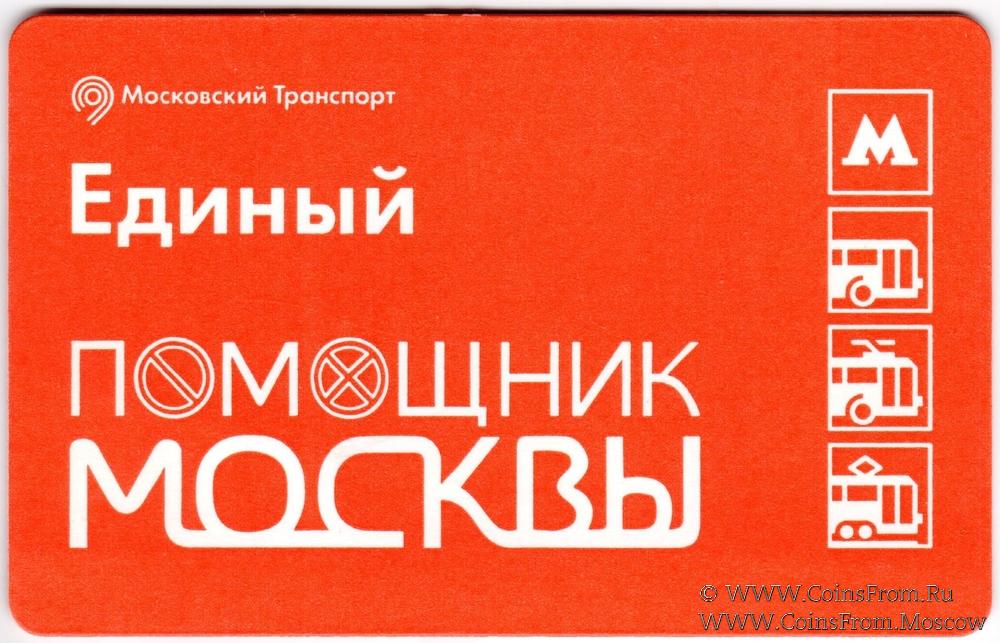 Билет "Единый". Размер: 85,5 * 54 мм. Дизайн: надпись на аверсе "Помощник Москвы", а на реверсе — QR-код для скачивания приложения. Карта посвящена мобильному приложению "Помощник Москвы".