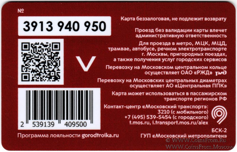 Карта сувенирная (3913) беззалоговая, не подлежит возврату. Проезд без валидации карты влечет административную ответственность. Для проезда в метро, МЦК, МЦД, трамвае, автобусе, речном электротранспорте г. Москвы, пригородных поездах, а также получения услуг городских сервисов.