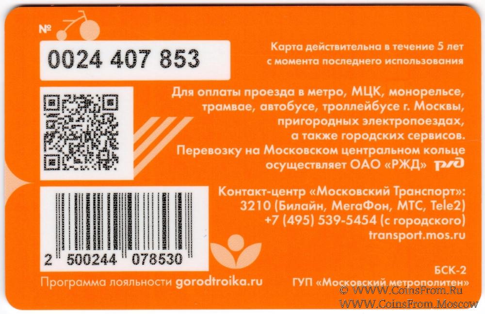 Электронная транспортная карта "Тройка". Размер: 85,5 * 54 мм. Вариант дизайна № 2. Карта выпущена в честь Московского велофестиваля (19 мая 2019).