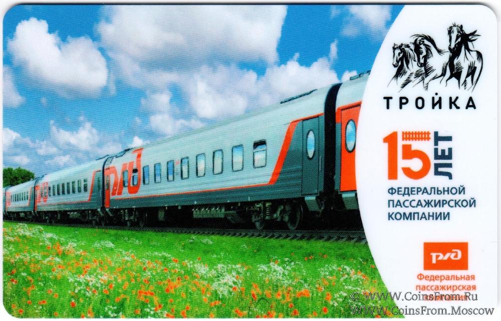 Электронная транспортная карта "Тройка". Размер: 85,5 * 54 мм. Карта "Тройка", посвящённая 15-летию Федеральной пассажирской компании (ФПК – дочерняя компания ОАО "РЖД"). Вариант 1.