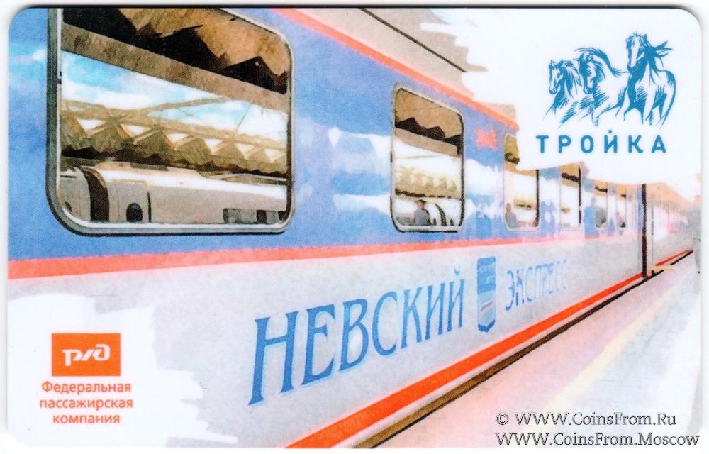 Электронная транспортная карта "Тройка". Размер: 85,5 * 54 мм. Карта "Тройка" с рисунками фирменных поездов Федеральной пассажирской компании (ФПК – дочерняя компания ОАО "РЖД") - скоростной пассажирский поезд "Невский экспресс". На картах появился новый вариант первого абзаца на обратной стороне карты: "Карта беззалоговая, не подлежит возврату".