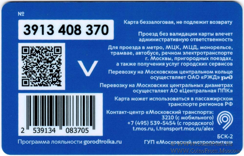 Карта сувенирная (3913) беззалоговая, не подлежит возврату. Проезд без валидации карты влечет административную ответственность. Для проезда в метро, МЦК, МЦД, монорельсе, трамвае, автобусе, речном электротранспорте г. Москвы, пригородных поездах, а также получения услуг городских