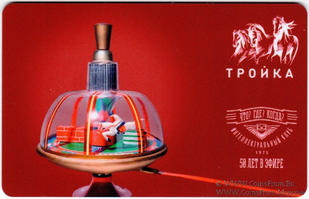 Электронная транспортная карта "Тройка". Размер: 85,5 x 54 мм. Серия из четырёх карт "Тройка", посвящённая 50-летию телевизионной интеллектуальной игры "Что? Где? Когда?". Вариант 1 (волчок).