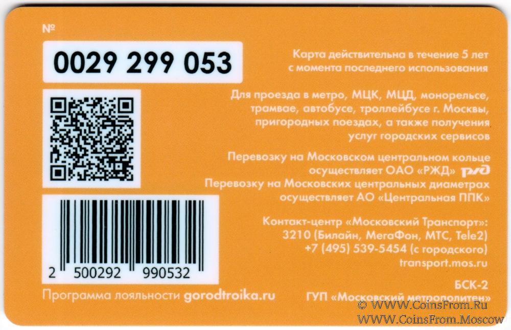 Карта залоговая (0029) действительна в течение 5 лет с момента последнего использования. Для проезда в метро, МЦК, МЦД, монорельсе, трамвае, автобусе, троллейбусе г. Москвы, пригородных поездах, а также получения услуг городских сервисов.