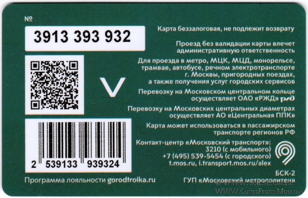Карта сувенирная (3913) беззалоговая, не подлежит возврату. Проезд без валидации карты влечет административную ответственность. Для проезда в метро, МЦК, МЦД, трамвае, автобусе, речном электротранспорте г. Москвы, пригородных поездах, а также получения услуг городских сервисов.