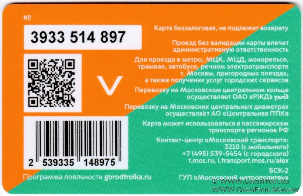 Карта подарочная (3933) беззалоговая, не подлежит возврату. Проезд без валидации карты влечет административную ответственность. Для проезда в метро, МЦК, МЦД, монорельсе, трамвае, автобусе, речном электротранспорте г. Москвы, пригородных поездах, а также получения услуг городских сервисов.