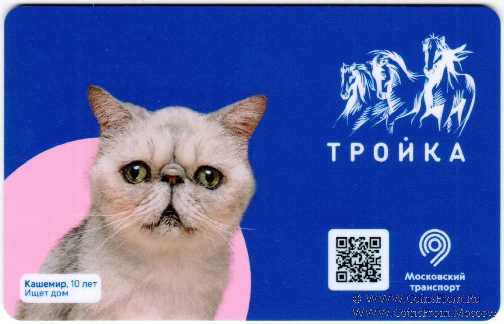 Электронная транспортная карта "Тройка". Размер: 85,5 * 54 мм. Две серии по 5 карт "Тройка", посвящённых поиску новых хозяев для бездомных животных; Серия 2: "Кашемир".