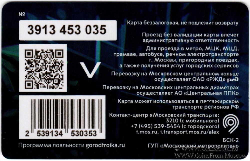 Карта сувенирная (3913) беззалоговая, не подлежит возврату. Проезд без валидации карты влечет административную ответственность. Для проезда в метро, МЦК, МЦД, монорельсе, трамвае, автобусе, речном электротранспорте г. Москвы, пригородных поездах, а также получения услуг городских сервисов.