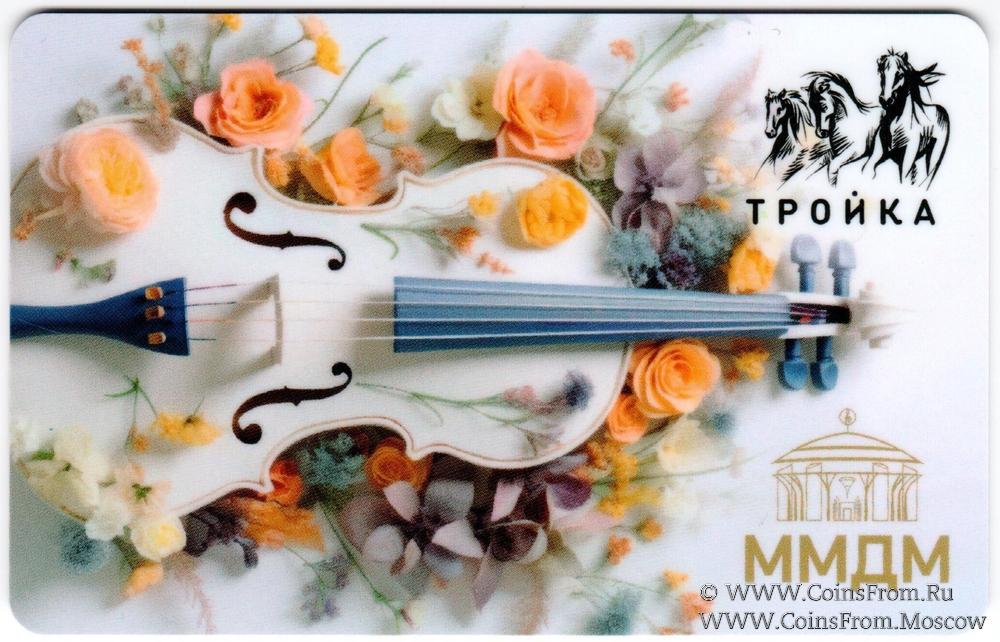 Электронная транспортная карта "Тройка". Размер: 85,5 * 54 мм. Карта "Тройка" выпущена совместно с Московским международным Домом музыки (ММДМ). Общее :название выпущенной серии из 4-х карт — "Весенняя симфония", на картах изображены музыкальные инструменты в окружении цветов (Вариант 3: Скрипка белая).