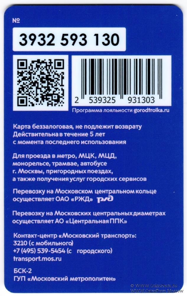 Электронная транспортная карта "Тройка". Размер: 85,5 * 54 мм. На аверсе: дизайн, посвященный Мобильному приложению "Метро Москвы". Серия из 3-х беззалоговых карт (вариант 3).