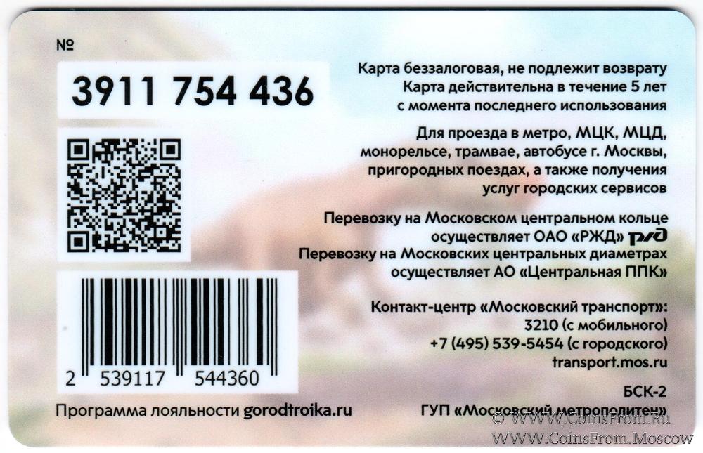 Электронная транспортная карта "Тройка". Размер: 85,5 * 54 мм. Дизайн карт с изображением древних животных (килеск) разработан на основе акварельных рисунков художницы музея Анжелики Беляевой. Выпущена к открытию выставки "Русский палеоарт".