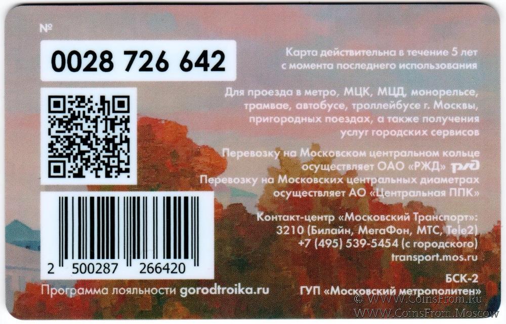Электронная транспортная карта "Тройка". Размер: 85,5 * 54 мм. На аверсе: дизайн: Метро. #сезонметро. Карта выпущена в честь открытия художественной выставки "Сезон метро: вид сверху".