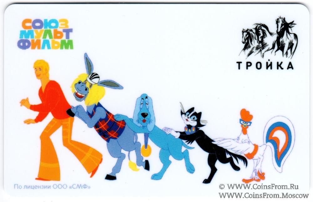Электронная транспортная карта "Тройка". Размер: 85,5 * 54 мм. На аверсе: дизайн Союзмультфильм: Трубадур и Осёл, Собака, Кот, Петух ("Бременские музыканты"). Серия из 4-х карт.