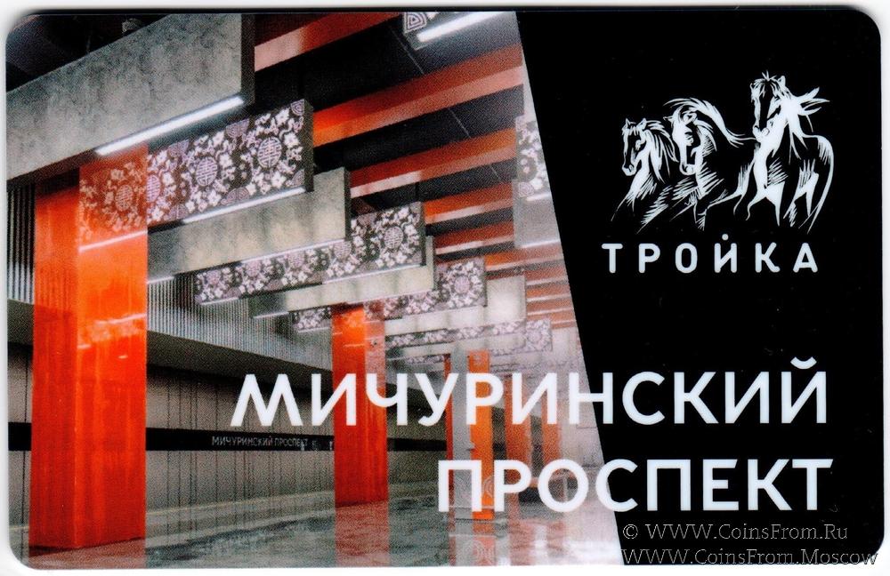Электронная транспортная карта "Тройка". Размер: 85,5 * 54 мм. На аверсе: дизайн Станция метро "Мичуринский проспект". Станция БКЛ открыта 7 декабря 2021 г.
