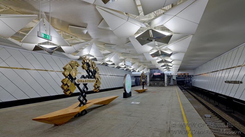Электронная транспортная карта "Тройка". Размер: 85,5 * 54 мм. На аверсе: дизайн Станция метро "Ольховая". Станция Сокольнической линии (1) открыта 20 июня 2019 г.