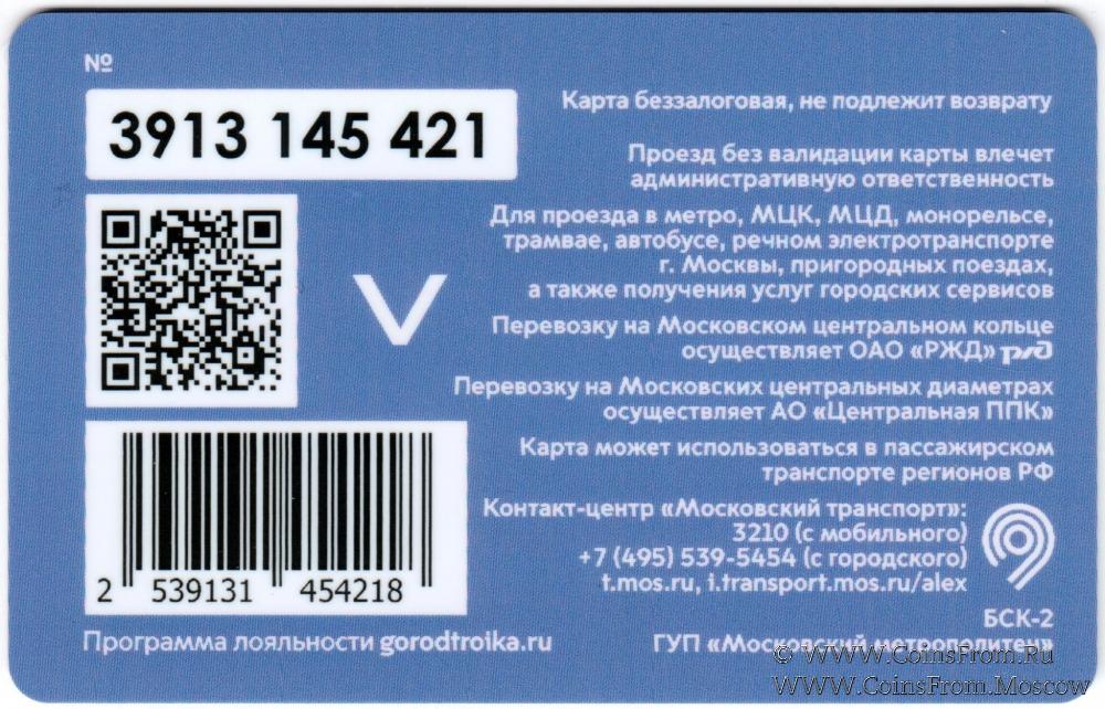 Карта беззалоговая (3913), не подлежит возврату. Проезд без валидации карты влечет административную ответственность. Для проезда в метро, МЦК, МЦД, монорельсе, трамвае, автобусе, речном электротранспоре г. Москвы, пригородных поездах, а также получения услуг городских сервисов.