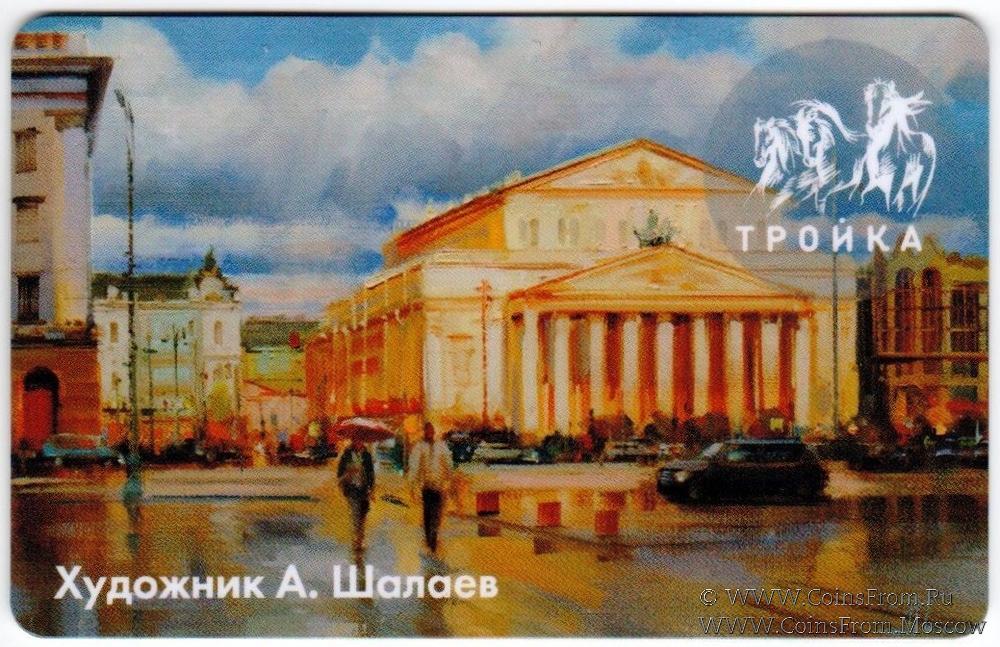 Электронная транспортная карта "Тройка". Размер: 85,5 * 54 мм. На аверсе: картина художника Алексея Шалаева (Городской пейзаж. Большой театр).