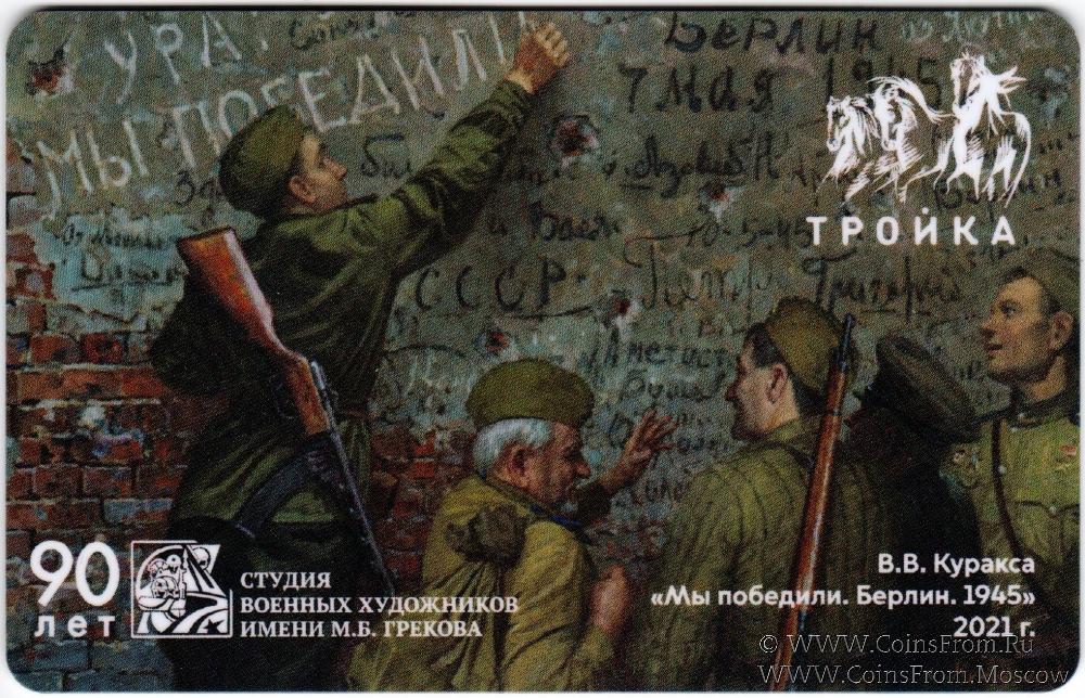 Электронная транспортная карта "Тройка". Размер: 85,5 * 54 мм. Тематическая карта "Тройка" посвящена 90-летию Студии военных художников имени М. Б. Грекова. Выпуск 1 (серия из 7 карт): Куракса В.В. "Мы победили. Берлин. 1945" 2021 г.